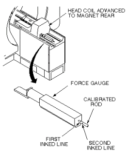 - Press IN SLOW button on magnet enclosure until head coil comes to a stop against force gauge. The force of the advancing head coil causes the force gauge calibrated rod to protrude from rear of force gauge.