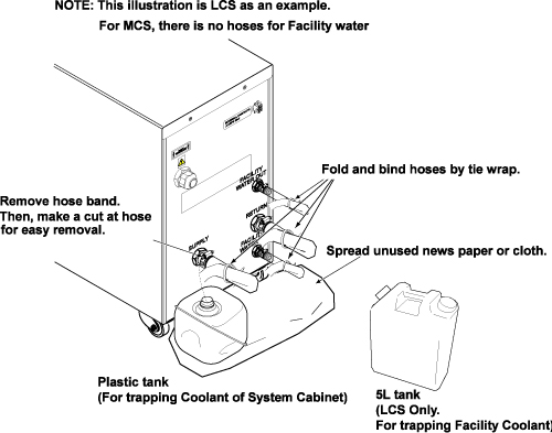 - Connect 500 mm hose to inlet and outlet of MCS with clamps.