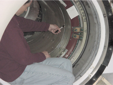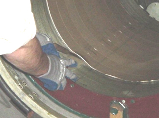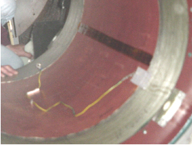 - On the Service end of the Gradient, apply a strip of Kapton Tape 46-208785P2) to secure the exposed edge of the RF shield Teflon Spacer. Apply tape starting at 270o point over the entire circumference. Half of the tape should be applied to BRM ID FRP and half to the edge of the RF shield Teflon spacers. The tape is used to eliminate noise cause by gradient blower air moving through the Teflon Spacers.