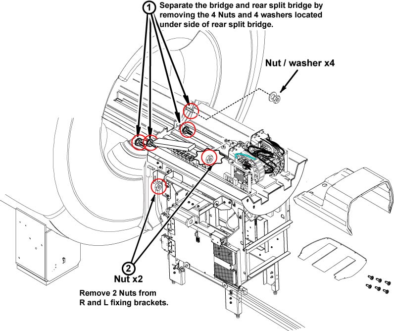 - Remove 4 nuts and 4 washers from back side of rear split bridge.