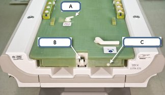 - Person 2: Standing at the head end of the table, at the same time, manually rotate the transfer board cradle release lever (A) and push in the cradle release button (C).