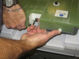 - Person 1: Standing at the foot end of the table, depress the dock pedal to lower the cradle latch block (B).