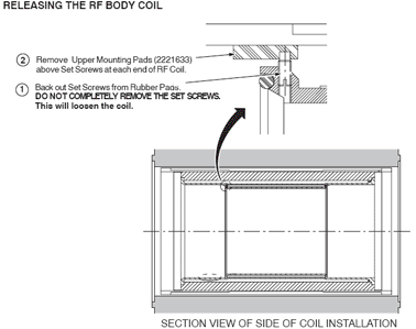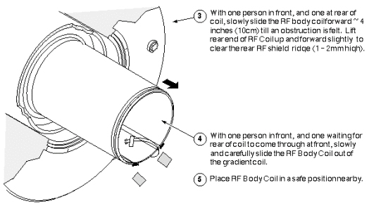 The RF body coil cartridge is a Field Replaceable Unit (FRU) that mounts inside the gradient coil (also a FRU). It is available in 1.0T and 1.5T versions. If the RF coil fails, it must be removed from the gradient coil and replaced. Since the replacement procedures for the RF and gradient coils are closely related, references are made below to the epoxy-filled gradient coil replacement procedure where instructions for removal of similar parts (for example, the bridge) can be found. While a portion of the following procedure can be accomplished by one person (connecting/disconnecting various cables, etc.), replacing a failed RF body coil requires more than one person.
