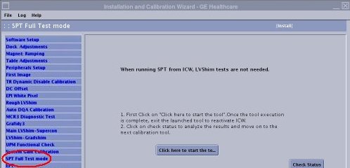 If SPT will be started from ICW, select [Calibration Wizard] from the calibration menu and select [Click here to start this tool]. Once the Calibration Wizard starts, select [SPT Full Test Mode] from the menu, review and okay the pre & post-dependencies, and select [Click here to start this tool] to start the procedure.