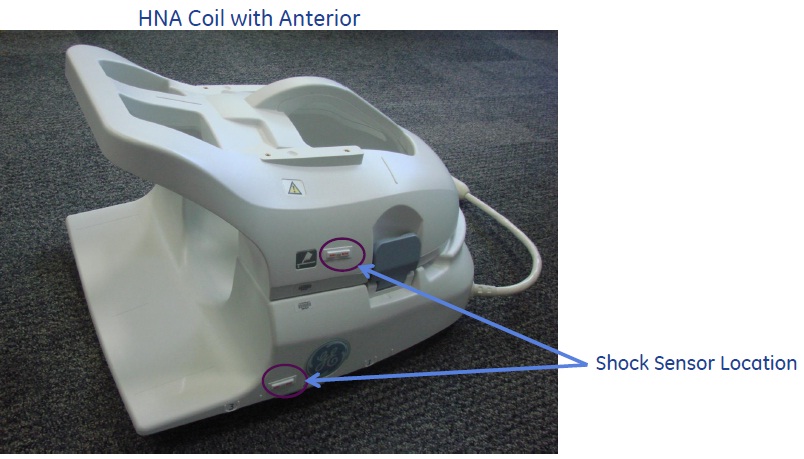 Only one shock sensor should be installed per coil, except for coils that contain two or more pieces that can be stored separately, such as the Torso Coils and Head, Neck, Spine (HNS) Coils. These coils should have a shock sensor located on each of the sections. Refer to the related coil illustration for proper placement.
