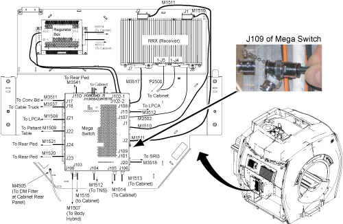 - The Mulit-Generational Data acquisition/Radio Frequency (MGD/RF) are now in the receive mode and any noise can be observed at the Mega Switch Spike Detect port. The scope must be in auto trigger mode.