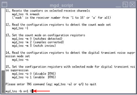 - Once the mgd_script page opens, at the command line type: mgd_tns -b m=1 0Enter to turn off