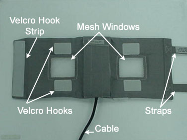 The 3.0T General Purpose (GP) Flex Coil consists of one major assembly shown below. The unit is 22 in (55.6 cm) long (not including straps) by 9 in (22 cm) wide. It has two mesh windows that indicate the open center of the two coils and aid in positioning. Two 31 in (78.5 cm) straps are attached to one end of the coil fabric. The undersides of these straps are covered with Velcro that attach to a Velcro hook strip at the other end of the coil, and to four Velcro hooks located above and below the mesh windows. A 72 in (183.3 cm) RF cable exits the material on one of the long sides and has a BNC connection that attaches to the surface coil quick disconnect box.