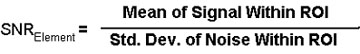 The SNR calculation uses the mean of the signal image and standard deviation of the noise image. SNR is measured for each element, not on the composite image.