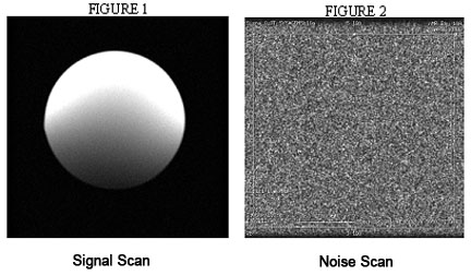 The image quality check uses two different protocols for signal and noise image acquisition. The signal scan is an FSE sequence used to minimize susceptibility and B0 inhomogeneity effects. The noise scan is a GRE sequence that has a Control Variable (do_noise) to eliminate the transmit RF completely during the scan. The signal scan must be run before the noise scan because the R1, R2, and TG values from the signal scan are used for the noise scan.