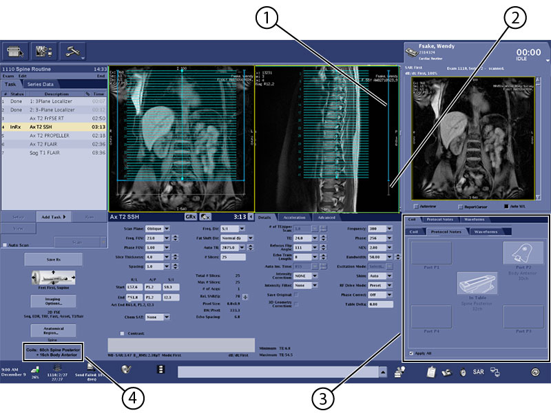 With ACRx, the user selects physical coils from a simple interface with large icon buttons for each coil. The coil extents are shown gray for the entire coil and blue for active elements. Physical coil names, rather than coil modes, are shown on the interface.