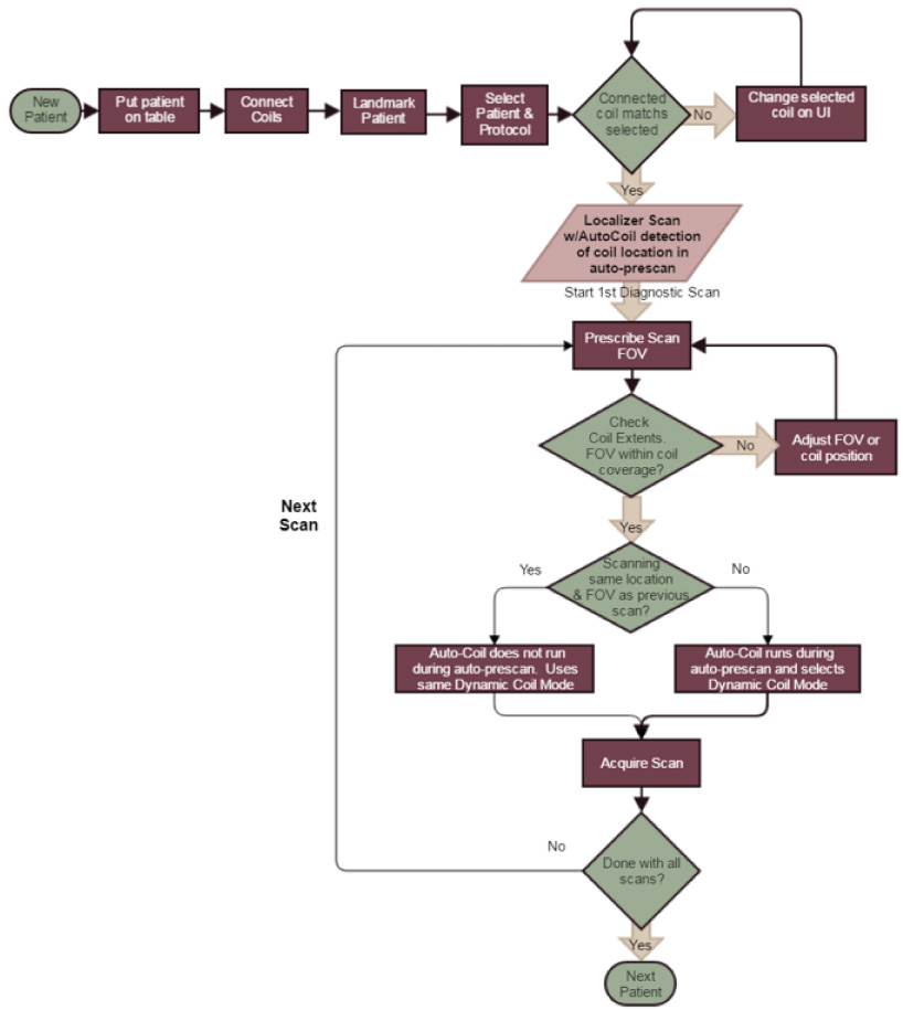 With ACRx dynamic coil modes, coil landmarking is no longer required. The site can set up protocols to allow the use of any connected coil. This means that users can use different coils more easily, reducing pop-ups/changes. ACRx selects the best coil elements automatically so there are no coil modes for the users to select. The calibration is hidden from users as it runs during prescan. The location of the coil is detected and shown on the graphic rx user interface as coil extents. The users can see the location of the entire coil as well as the portion of the coil that is active for the scan.