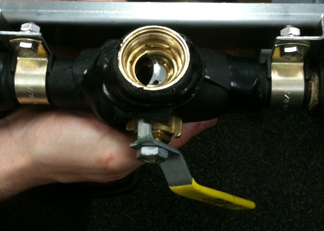 Open the 1-1/2 in. ball valves to continue the draining process until the primary cooling loop is completely drained (fluid stops running from the drain hose).