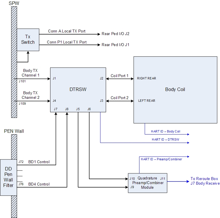 The dual transmit switch (DTRSW) contains the body TR circuitry needed to properly route the transmit and receive signals and to protect the body preamps and combiner assembly from signal overload. It does not contain quadrature phase shifting circuitry because this function is performed by the 3.0T DTX1 exciter.