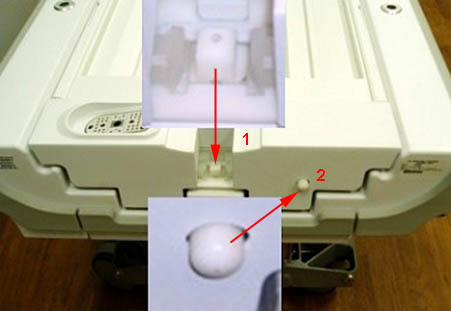 Locate the front of the patient table and the buttons. Push the button labeled 1 (in Figure 1) down toward the floor while pushing the button labeled 2 in.