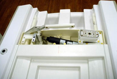 Reinstall the latch catch and the seventh screw on the anterior cover. The post of the latch catch fits into the anterior section of the coil and can be positioned in one direction.