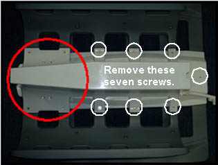 Remove the six screws from the PA coil or PA filler. Carefully move the filler enough to clear access to the cotton rod. Be careful not to strain the attached cables while moving the filler.