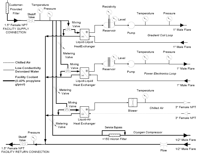 The customer is responsible for providing cooling water with up to 40% propylene glycol by volume for intake by the HEC. Coolant pH range, coolant quality, and filtration requirements are in the Pre-Installation Manual for the given MR system. Any deviation of temperature or pressure outside of limits is reported to the system message log.