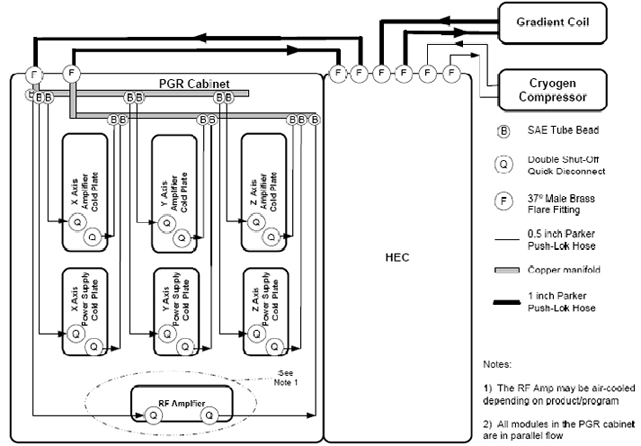 Supply and return connections for the gradient coil are 1 inch, 37° (JIC) brass, male, flare fittings located at the top of the HEC. The supply connection on the gradient coil has a blue color indicator, and the return connection has a black color indicator. Supply and return gradient coil connections are electrically grounded to the cabinet, because the coolant is exposed to 660 amps ±1,650 volts inside the gradient coil.