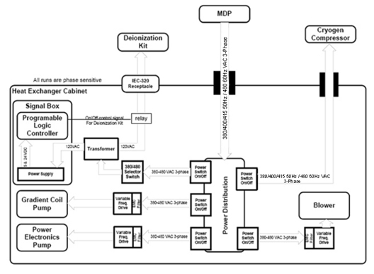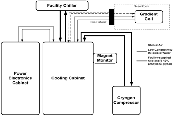 Facility (customer) coolant is provided to the HEC. Dual-loop, liquid-to-liquid heat exchangers are used to circulate DVMR coolant through the power, gradient and RF (PGR) cabinet and gradient coil, critical components of an MR system. The heat exchanger module isolates the deionized water closed-loop coolant from the facility coolant so that these do not come into contact and mix. The HEC must control and monitor control parameters and interface to the MR system. A small portion of customer coolant is provided to the cryocooler compressor. The HEC also houses a chilled air blower and provides cryocooler compressor temperature and volumetric flow signals to the magnet monitor.
