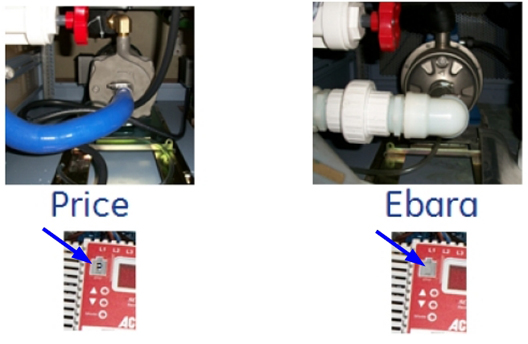 Beginning in early 2012, HEC cabinets began shipping with pumps from the manufacturer, Price. The pump type must be exactly matched with the correct VFD chip or there will be either high pressure or low flows, risking equipment damage and/or system errors. Price pumps can be identified by an irregularly shaped pump face. The older Ebara pumps have a circular pump face. Ebara VFD chips do not have any markings on them; the Price chips are identified with a “P”.