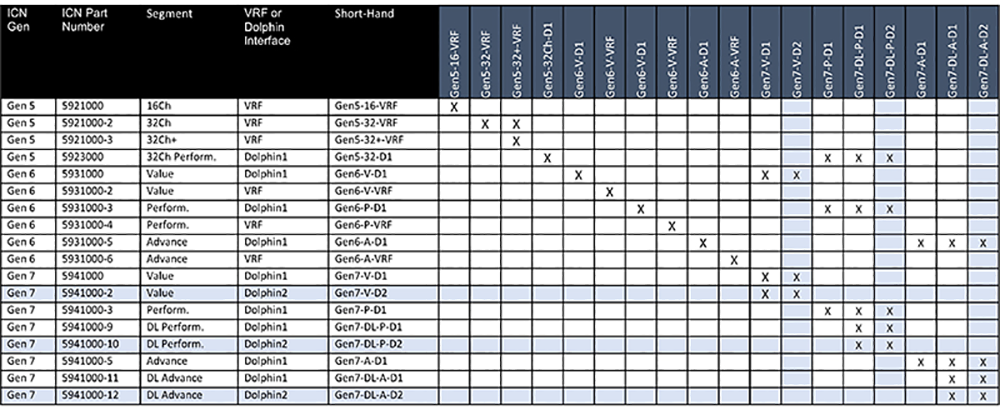 Note: This table represents the possible replacement ICNs for each model. Find the installed model on the left and see what models can be used to replace it. Make sure you have the proper software level to support all possible options as well as PCIe cable if changing dolphin board types.Figure 5. Compatibility matrix