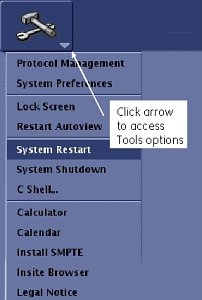 To restart the system, click the arrow on the Tools High Level Access tab, select , and click Yes to confirm the restart.