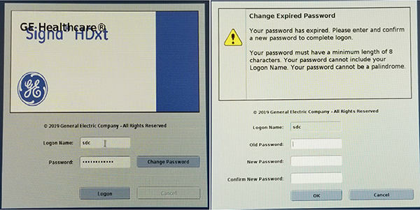 This step is applicable to new installations only. Software upgrades from earlier revisions or re-LFCs with good SaveInfo media will transfer older passwords and will not need to change the passwords on initial login. Warning: You must accurately follow the Changing passwords procedure. See Changing passwords. If you do not follow the procedure as indicated, the system could lock up and become inaccessible for service and/or clinical use. The only option for recovering from forgotten passwords is to reload the software without using RestoreInfo and complete all system calibrations. Software versions DV28 and later