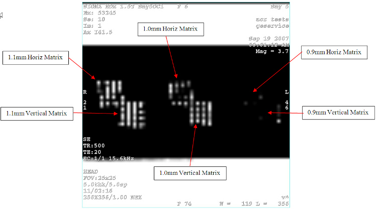 The ACR phantom scanning instructions specify using Graphic Rx when prescribing the 11 slices on the ACR sagittal localizer image. The pixel dimension in the sagittal localizer is 0.976 mm2. The Graphic Rx screen uses slightly less than a quarter of the screen to display the sagittal localizer image when graphically prescribing the slices. Very small movements of 1 pixel on the graphic Rx lines correlate to almost a millimeter of slice location placement. Small slice location errors can be induced if the Graphic Rx lines are not placed perfectly over the sagittal localizer. Using the manual slice location prescription method described in Slice Position Accuracy sometimes provides better slice position accuracy.