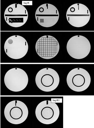 The low contrast objects appear on slices 8, 9, 10 & 11 with contrast ratios of 1.4%, 2.5%, 3.6%, and 5.1% respectively per slice. In each slice, the low contrast objects appear as rows of small disks radiating from a center hub like spokes on a wheel. Each wheel (one per slice) is composed of 10 spokes and each spoke is composed of 3 same sized disks along its length. The largest disks are 7.0 mm in diameter on spoke 1 at its approximate one o’clock position. The disk size progressively decreases to a minimum of 1.5 mm on last spoke 10 at its approximate 11:30 position as the spokes progress clockwise.