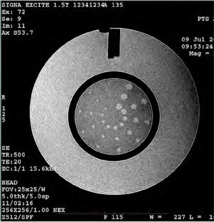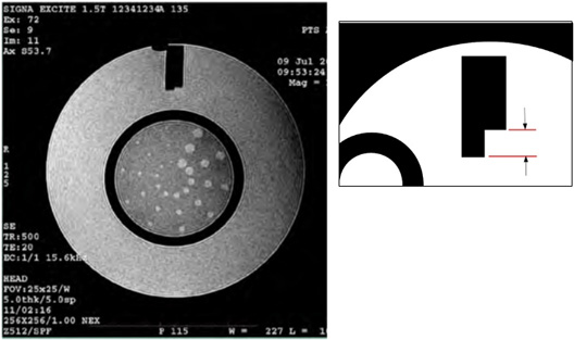 If the ACR phantom contains a bubble, be careful when making any measurements to ensure that the bubble is not affecting those measurements. For instance, when taking geometric accuracy measurements (see Geometric Accuracy), a bubble at the very top of the axial image could prevent you from making an accurate A/P length measurement.