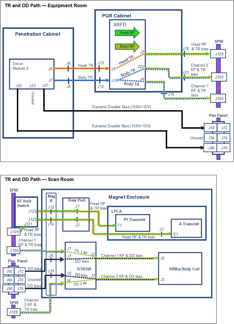 Body TR bias is supplied by the driver module to the dual drive amplifier where it is split and then introduced, along with the channel 1 and 2 RF transmit signals, onto the channel 1 and 2 RF transmission lines. The body TR bias and channel 1 and 2 RF signals are routed down the channel 1 and 2 transmission lines to the DTRSW module. The body TR bias is then used by channel 1 and 2 circuitry inside the DTRSW module to ensure proper routing of transmit and receive RF signals. The body TR bias does not exit the DTRSW module and is not applied to the RF body coil.