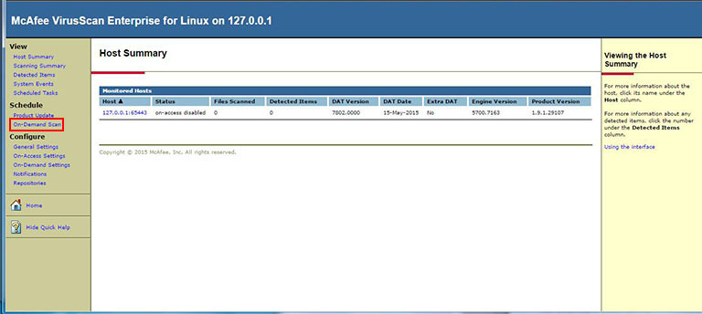 Note: On-Demand Scan will take 30-60 min (depending on system load and number of files) if scanning all files under the / directory. The scan will be aborted if the system is shut down or rebooted during the scan.Virus scanning may affect system performance and scanner operation. Do not run a virus scan during MR scanning activity. Query virus scan results using ePO.