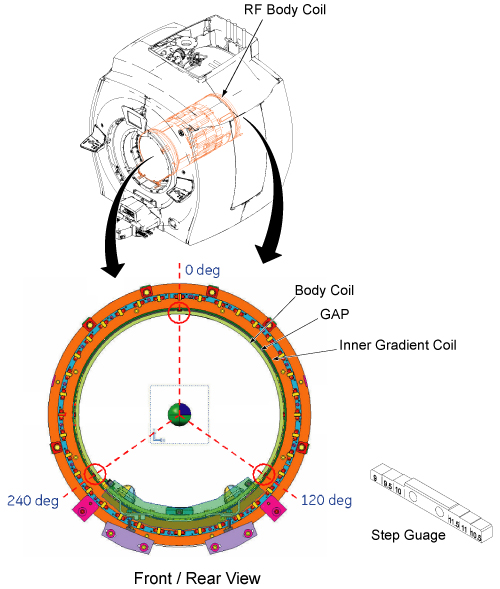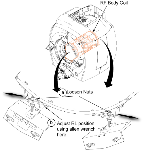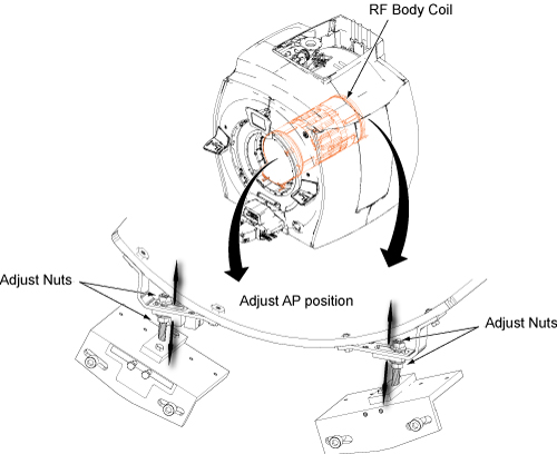 - 1. After re-tightening any loosened nuts, check RL position and AP position of Front End and Rear End again per Body coil RL alignment and Body coil AP alignment and adjust the position if necessary until the specifications are satisfied.