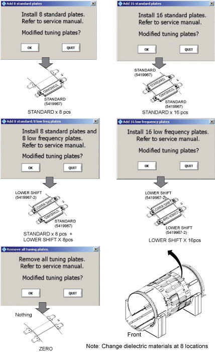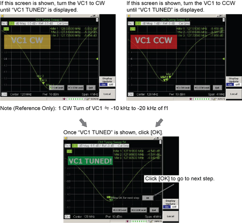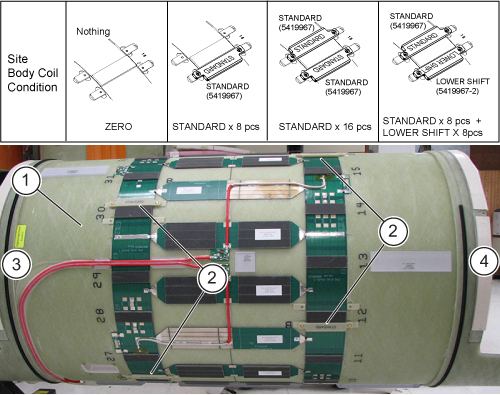 Body coil tuning is performed by adjusting variable capacitors (VC1, VC2, VC3) to tune f1, f2, f3, and MagS21 according to the network analyzer screen. If it is difficult to adjust parameters by variable capacitors, replacement of dielectric material might be required (also according to the network analyzer screen).