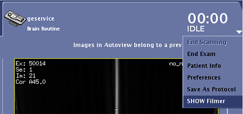 From any Session tab (with the exception of Protocol session), select SHOW Filmer from the menu.