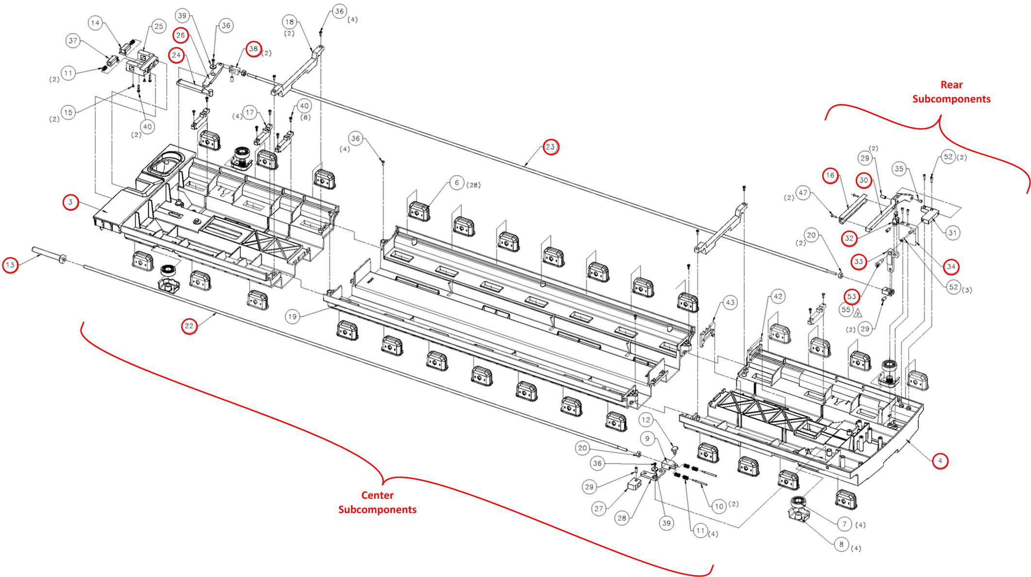 - Refer to the cradle assembly drawing to replace any of the front subcomponents in the Replacement Parts list.