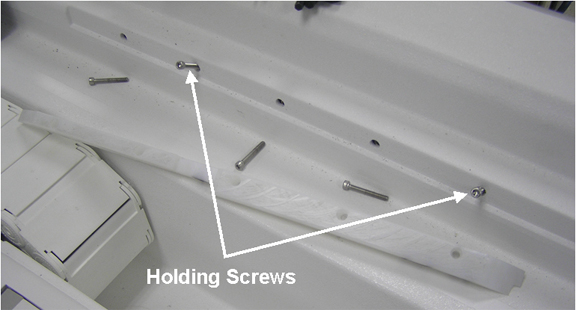 Two guide rails (LH and RH) are used to guide the cradle when moving the cradle forward and backward on the table top. Fives screws secure each guide rail to the table top. Each screw mounts through the guide rail and table top to the nut bar. The nut bar is not secured to the table top. To prevent the nut bar from dropping into the table top, always have two screws mounted. Carefully follow each step in this procedure to make sure the nut bar does not drop into the table top during removal or installation. If nut bar drops into the table top, the bottom panel of the table top must be removed to retrieve the nut bar.