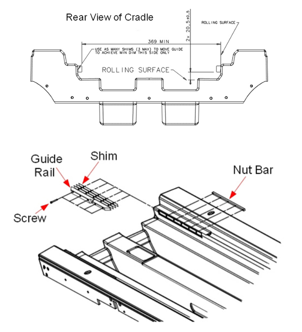 This procedure describes how to replace the cradle guide rail. The cradle is locked in the home position with a latch on the patient table bridge. The latch engages a notch on the cradle guide rail at the rear of the table. The latch on the cradle should engage this notch just enough (without extra force) so when the cradle is pushed to the home position, it tightly engages the notch to prevent the table top from moving when the patient table is undocked. In certain situations, it may be necessary to add up to a maximum of 3 shims to achieve a minimum distance of 369 mm.