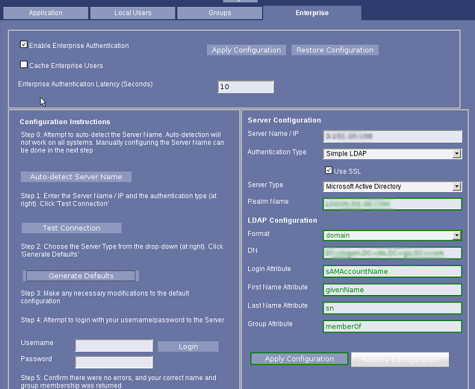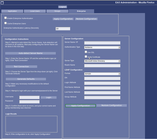 2. Select Enable Enterprise Authentication and click Apply Configuration.