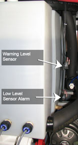 ITEM DESCRIPTION 1 6 inches from top coolant level sensor 2 Level of top coolant level sensor There are two sensors on the right side of each tank. The top sensor is a warning level sensor that notifies the operator when the coolant is low. The lower sensor on the right of the tank is a low level alarm that signals the operator when the coolant reaches a dangerously low level and the system will stop scanning.