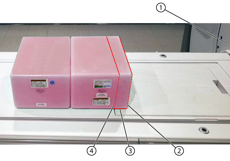 Important: Make sure that the front end of the first phantom (closest to the bore) overlaps the bottom edge of the flat filler panel 50mm. A slight misalignment of the phantoms and landmark may cause a false negative result from MCQA.