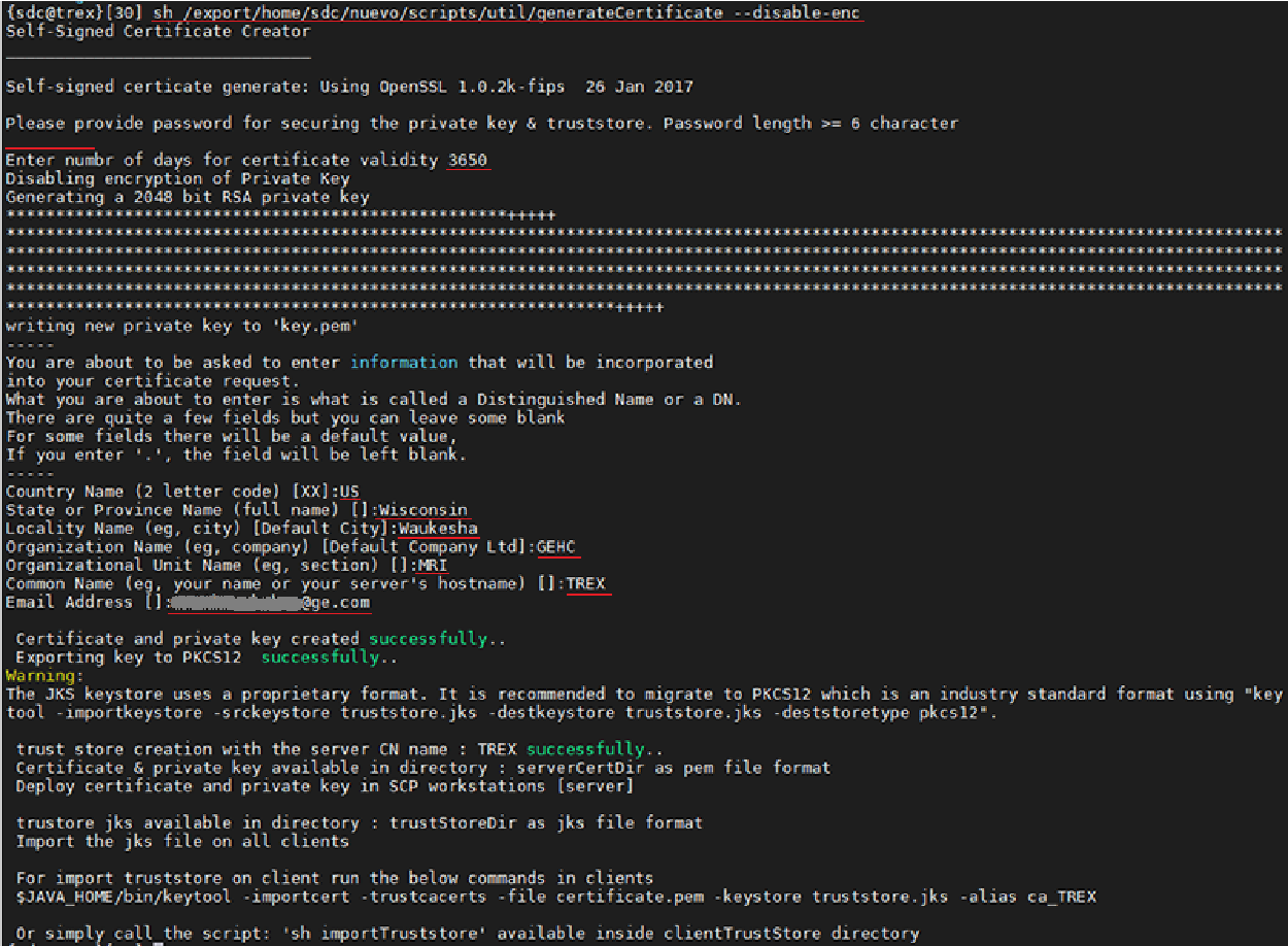 Execute the following command: sh /export/home/sdc/nuevo/scripts/util/generateCertificate --disable-enc