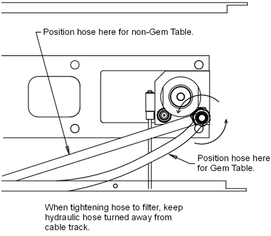 Before reassembling the table, make sure the hydraulic hose is positioned correctly. Use tie-wraps to secure the hydraulic line to the frame.