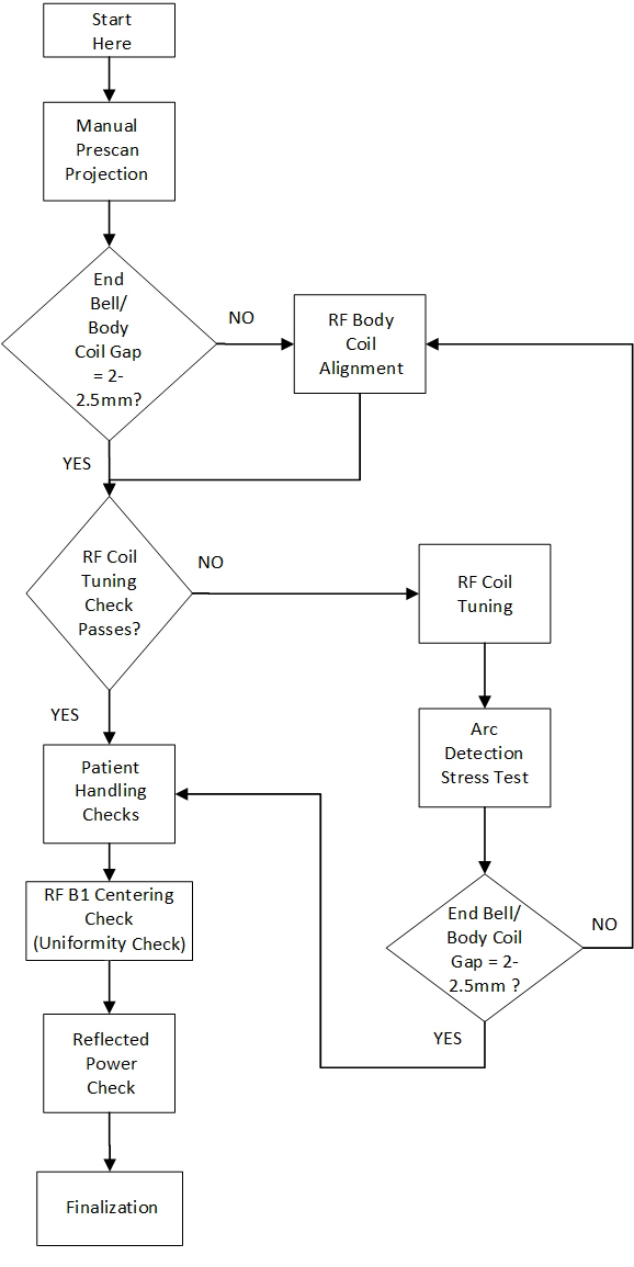 - If the tuning check passes, proceed to Patient Handling Checks. If the tuning check fails, proceed to RF Coil Tuning.