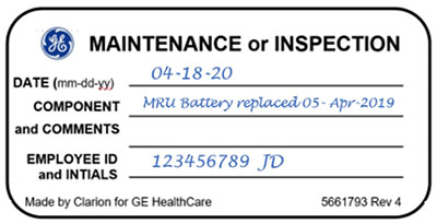 - Obtain the GE Equipment Maintenance or Inspection (5661793) sticker and complete all entries on the sticker including your name, employee ID, and today's date. Put the sticker on the MRU where it is easy to see.