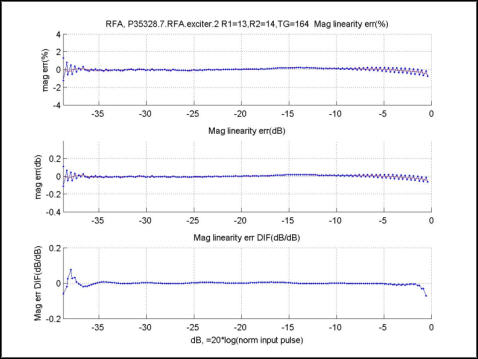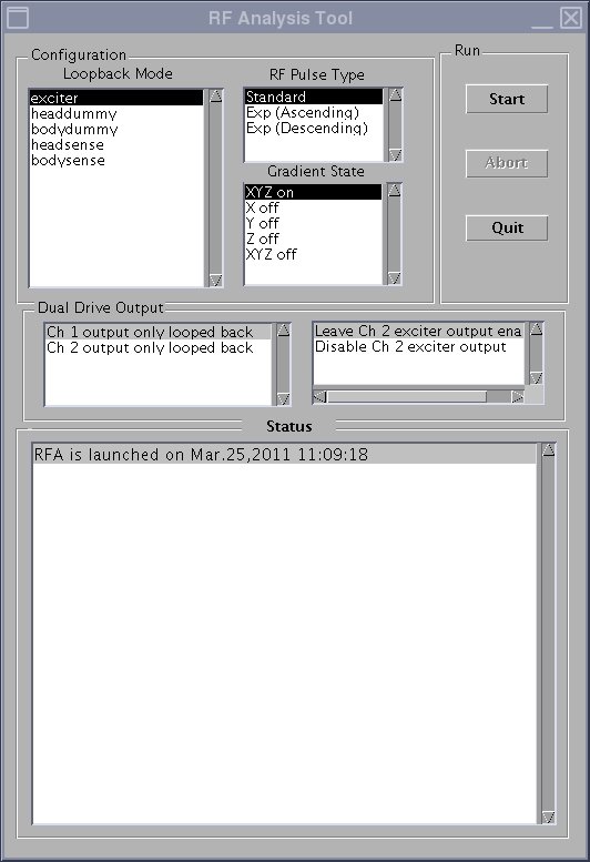 The RFA (radio frequency analysis) tool is designed to quantitatively measure the performance of the transmit chain by allowing loopback tests from several different points along the chain. At most points, the inter-pulse RF stability and inter-pulse RF fidelity (magnitude and phase linearity) can be measured.