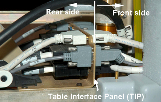 If a TIP is present on right side of table chassis, remove all front side cable connectors from the TIP, and secure them out of the way to fully expose the base of the hydraulic cylinder.Notice If a TIP is present, avoid stripping the lightweight aluminum screws when disconnecting the black cable connectors from the TIP.Removing the cable connectors on the right side of the table provides the best access to the hydraulic cylinder base.