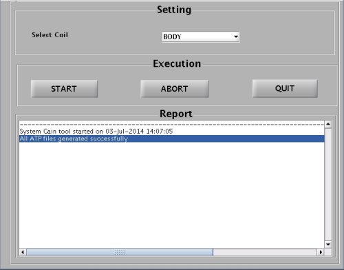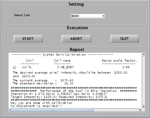 System gain calibration is performed to determine the body recon scale factors that will achieve a known level of image intensity when using the body coil with a known phantom solution and protocol. The goal is that when the same solution or tissue is scanned in either the standard body coil with the same protocol, those tissues will have approximately the same image intensity level on a given system and between systems of like type.