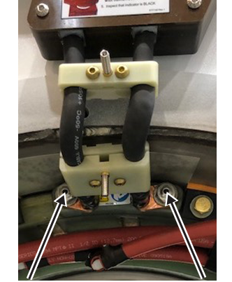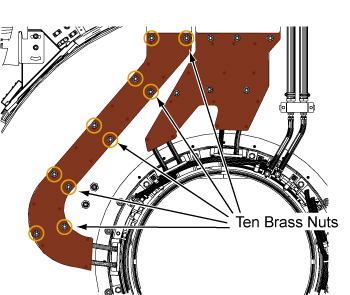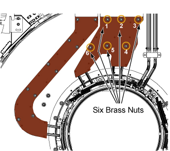 4. At the top of the busbar, remove the four M10 brass nuts and Nord-Lock washers that secure the gradient power cables to the busbar terminals. Slide the gradient power cable lugs off of the studs on the busbar.